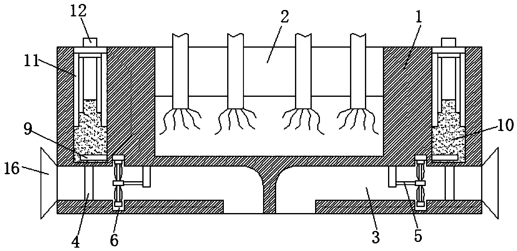 [0016]图中:1种植平台、2种植槽、3进风通道、4风压阀门、5叶轮、6环形槽、7滑杆、8摩擦块、9导热板、10装置腔、11伸缩套筒、12挡风板、13装置通道、14折叠气囊、15透光孔、16集风罩。
