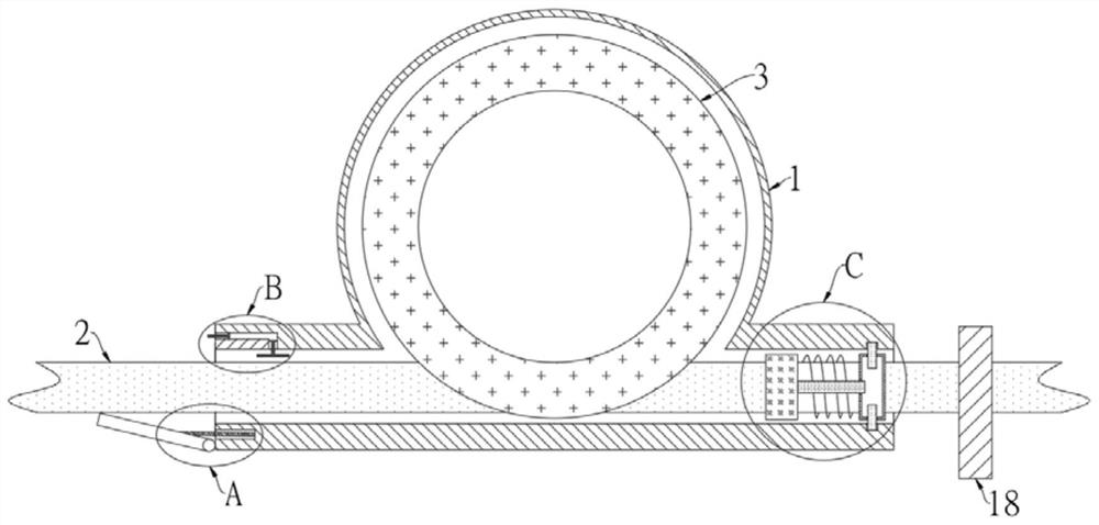 [0034]水下的线缆等距离通过多个弧形壳体1及其内零部件进行安装,当两个安装块18间的电缆2发生断裂时,电缆2会由拉直状态变为松软状态,此时断裂电缆2上的拉伸弹簧6会失去安装块18的拉力作用,进而拉伸弹簧6会在自身拉力的作用下带动固定块4靠近空心块5运动,同时固定块4在运动的过程中,会使其上的磁杆8进一步插入空心块5中,使空心块5中的两个磁性卡块7处于磁杆8的磁力作用范围内,两个磁性卡块7会被磁杆8吸合,与弧形壳体1脱离接触,此时弧形壳体1会从与电缆2的卡接状态转化为滑动状态。