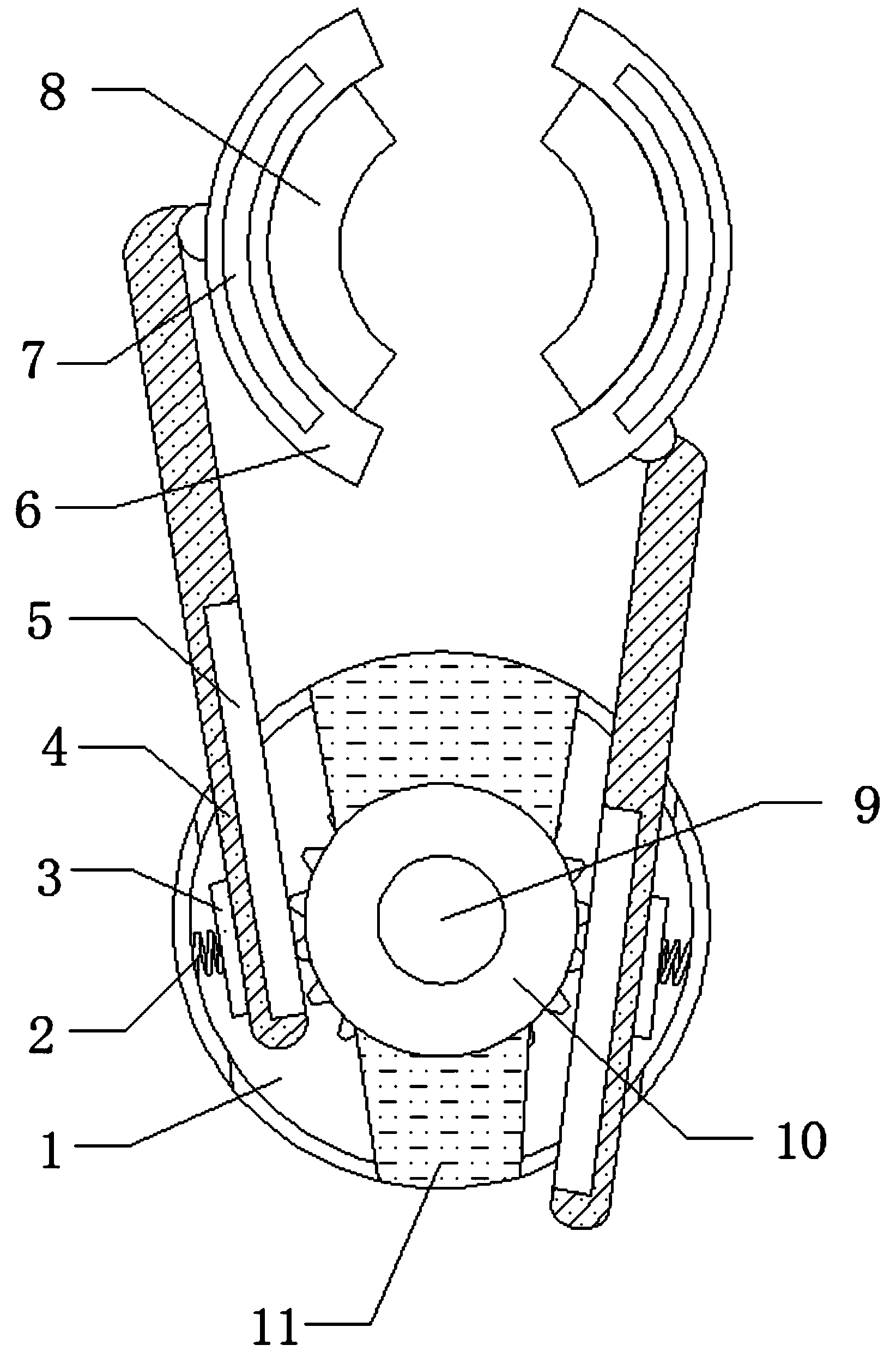 [0015]图1为本发明提出的一种农业生产用无伤移苗装置的俯视剖面结构示意图;图2为本发明提出的一种农业生产用无伤移苗装置的中空半环侧面结构示意图;图3为本发明提出的一种农业生产用无伤移苗装置的中空半环剖面结构示意图;图4为本发明提出的一种农业生产用无伤移苗装置的俯视结构示意图。