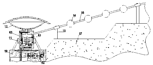 [0025]当使用时,首先在雨天时,本装置可进行雨水收集和发电,水由梯田17流入水池10的顶部,经过滤网32的过滤,进入连通管路20,雨水带动转动扇轮22转动,进而使传动皮带23带动大锥齿轮24转动,使传动锥齿轮25带动横轴27转动,从而使发电磁铁29转动,使发电线圈30可以进行电磁感应发电,控制第一电机47工作,使动力轴49转动,进而使动力带轮48带动从动带轮58转动,使传动轴59带动扇形齿轮55转动,使摆动板56以抽水管路19位圆心前后摆动,动力轴49带动动力锥齿轮50转动,进而使从动锥齿轮52转动,使搅拌轴36转动,进而使搅拌扇33可以进行搅拌,使水和肥料充分混合,通过控制第二电机70工作,使动力齿轮43转动,进而使第一挡板46可以向上或向下滑动,当第一挡板46向上滑动时,第一圆孔44上移,使抽水管路19与混合空间34不连通,此时从动齿轮42带动第二挡板38左移,使第二圆孔39左移,进而使肥料盒12与混合空间34连通,从而使化肥由肥料盒12掉落进混合空间34内,当第一挡板46向下移动时,第一圆孔44连通混合空间34和抽水管路19,此时第二挡板38向右移动,使肥料盒12与混合空间34不连通,控制水泵35工作,使水可以泵入排水管路16内,然后由洒水喷头14喷洒在梯田17上。