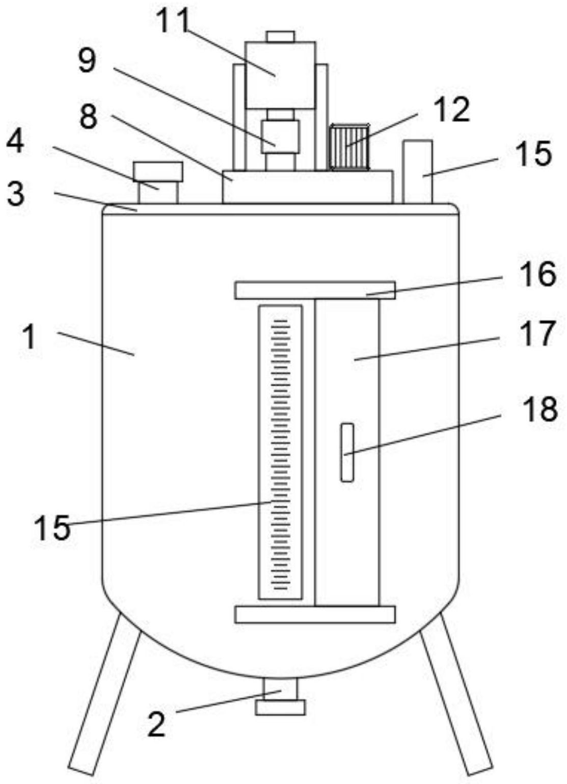 [0022]请参阅图1~4,本实用新型实施例中,一种农艺师用实验种子防潮存储箱,包括箱体1,所述箱体1的底部贯穿设置有出料管2,所述箱体1的顶部固定连接有顶盖3,所述顶盖3的顶部贯穿设置有注料管4、观察窗15,所述顶盖3的顶部贯穿设置有通气管5,所述顶盖3的顶部固定连接有防护盖8,所述通气管5的顶端贯穿防护盖8,所述通气管5与顶盖3、防护盖8转动连接,所述防护盖8的顶部通过支架10固定连接有鼓风机11,所述鼓风机11的出气管通过旋转接头9与通气管5的顶端转动连接,所述防护盖8的顶部固定连接有减速电机12,所述通气管5和减速电机12传动连接,所述通气管5的外壁均匀贯穿设置有多个分流管6,所述分流管6的表面贯穿设置有出气孔7。