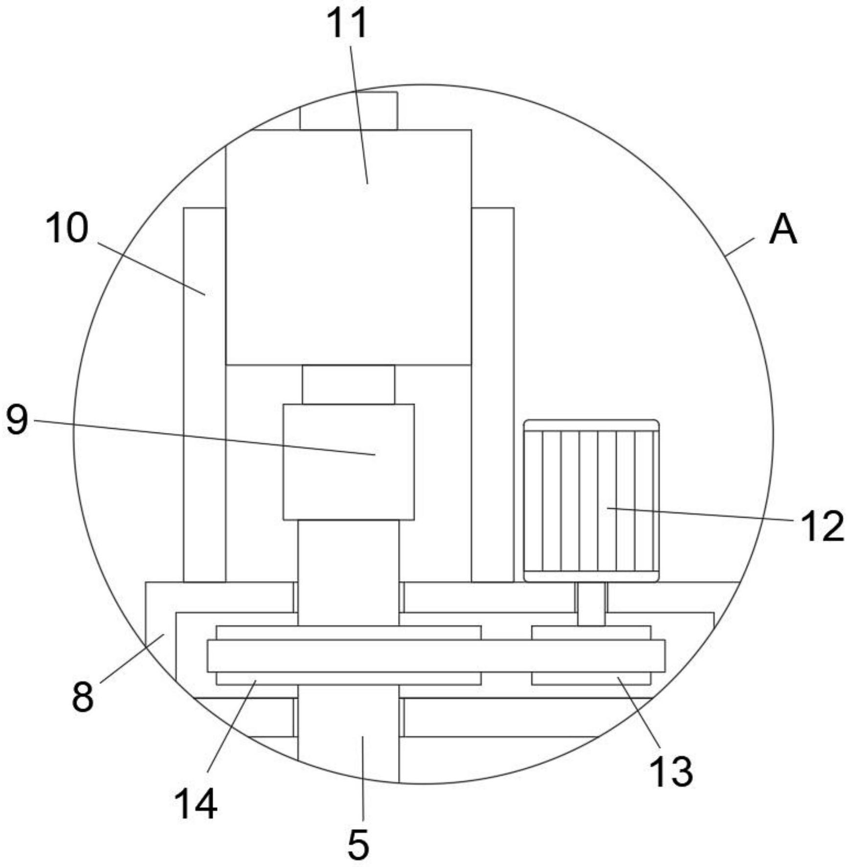 [0025]所述减速电机12的输出轴贯穿防护盖8的顶部后固定连接有第一链轮13,所述通气管5的外壁固定套接有第二链轮14,所述第一链轮13、第二链轮14通过链条传动连接。