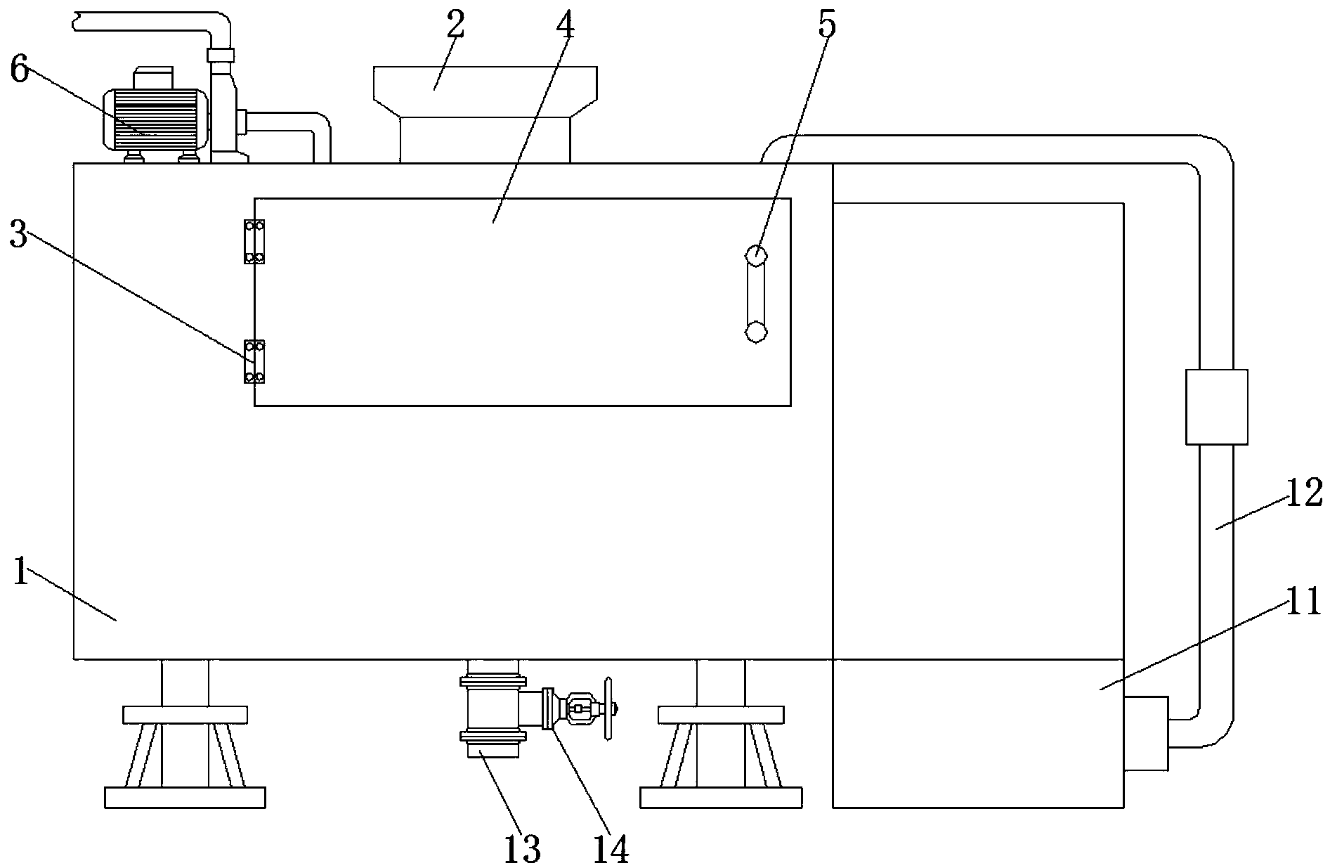 [0034]图中:1箱体、2进料斗、3合叶、4取料门、5把手、6清洗装置、61水 泵、62抽水管、63排水管、64喷头、7隔板、8搅拌装置、81稳固轴承、82 搅拌辊、83定位盘、84滑槽、85定位孔、86搅拌杆、87稳固箱、88减速电 机、89驱动齿轮、9定位装置、91气缸、92活塞杆、93通孔、94定位块、 95容纳槽、96第一复位弹簧、97第一定位杆、10筛选装置、1001第一固定 杆、1002第一固定轴承、1003从动齿轮、1004第一槽轮、1005第二固定杆、 1006第二固定轴承、1007第二槽轮、1008第一齿轮、1009传动带、1010第 三固定杆、1011第三固定轴承、1012第二齿轮、1013驱动杆、1014固定管、 1015从动杆、1016第二复位弹簧、1017固定槽、1018第一稳固杆、1019稳 固管、1020筛网、1021第二稳固杆、1022震动机构、102201滑管、102202 第一纵向杆、102203固定块、102204震动杆、102205第二纵向杆、102206 第三复位弹簧、1023支撑杆、1024第二定位杆、11吸尘装置、1101密封箱、 1102水箱、1103吸尘管、1104第一过滤网、1105抽风机、1106排风管、1107、 第三定位杆、1108排尘管、1109排尘孔、1110第二过滤网、12烘干装置、 1201集风箱、1202第一吹风管、1203加热器、1204第二吹风管、1205吹风 孔、13排液管、14阀门。
