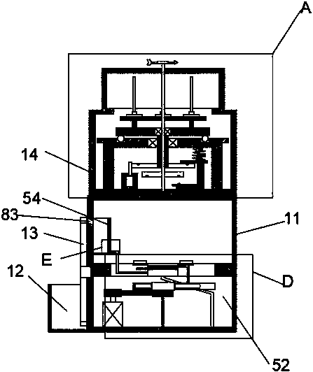 [0011]图1为本发明的一种基于风力发动机的农村卫生装置的整体结构示意图;图2为图1中“A”的放大结构示意图;图3是图2中“B-B”方向的放大结构示意图;图4是图2中“C”方向的放大结构示意图;图5是图1中“D”的放大结构示意图;图6是图1中“E”的放大结构示意图。
